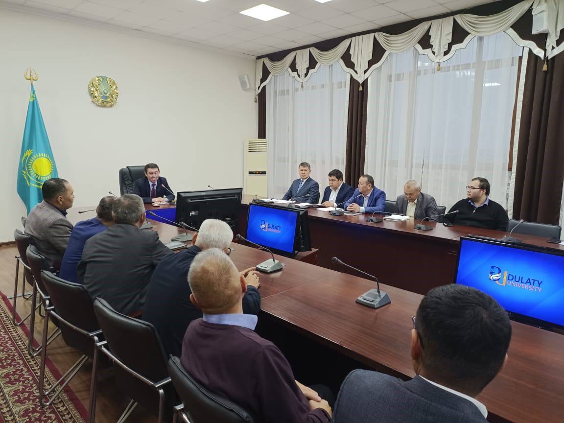 Дулати университеті қабырғасында Басқарма Төрағасы – Ректор Мұхтар Байжұмановтың қатысуымен Басқарма Мүшесі Ғылым және цифрландыру жөніндегі проректор Сейтжан Орынбаевқа қарасты құрылымдық бөлім басшыларының есебі, гранттық қаржыландыру жобалары мен мақсатты бағдарламалар жетекшілерінің ғылыми зерттеу жұмыстарды орындау барысы жөнінде кездесу өтті.