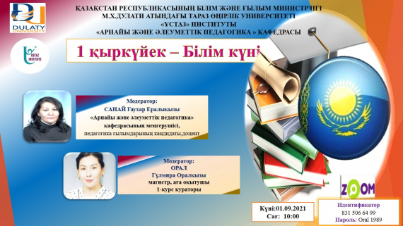 «Арнайы және әлеуметтік педагогика» кафедрасынң меңгерушісі, педагогика ғылымдарының кандидаты, доцент Санай Гаухар Ералықызы 1- курс студенттерін келіп жеткен жаңа оқу жылымен құттықтап, болашақ мамандарымызға сәттілік тіледі.Сондай –ақ қоғам талабына сай таңдалған мамандықтың қыр-сырын таныстырып, келешекте болашағы жарқын маман иелері болатындарына сенім артты.