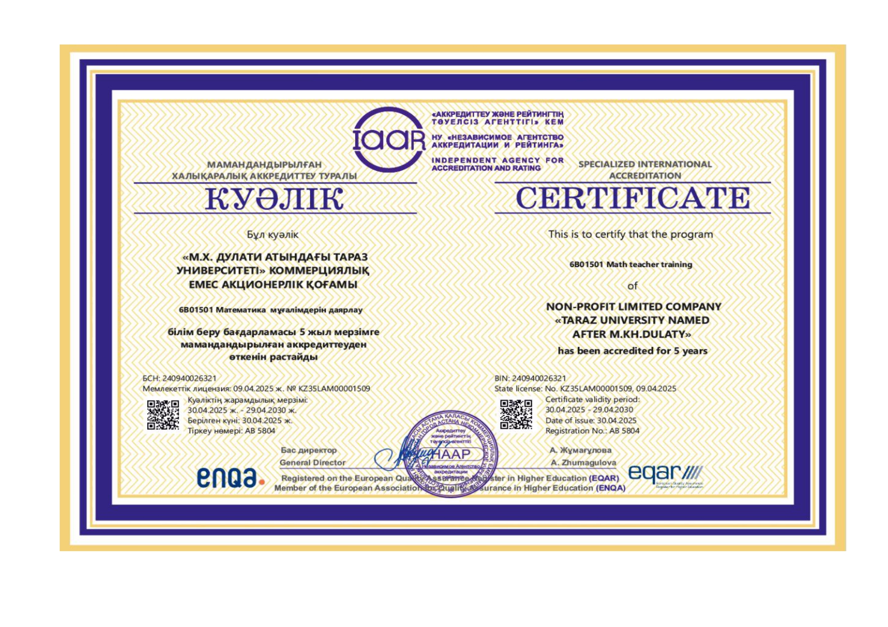 «Мамандырылған аккредиттеу туралы куәлік»