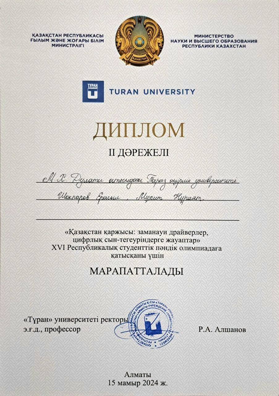 РСПО өткізудің мақсаты студенттердің оқу-танымдық және оқу-зерттеу қызметін ынталандыру, студенттердің кәсіби-тұлғалық әлеуетін ашу және неғурлым талантты және дарынды студенттерді қолдау болып табылады. Базалық РСПО 2 кезенде өткізілді: іріктеу (сырттай) және күндізгі кезең 2024 жылгы 15 мамырда. Іріктеу кезеңі жоғары оқу орындарының олимпиада тақырыбы бойынша бейне-визиткалар мен жобаларды ұсынуын көздеді, іріктеу қорытындысы 2024 жылгы 10 мамырга дейін жарияланды. Күндізгі кезенде 1 кезеңнен өткен командалар тестілеуден, команда капитандарының «Finance IQ» байқауынан өтті. Тестілеу, капитандар конкурсы және Олимпиада тақырыбындағы жобаларды корғау нәтижелері бойынша жеңімпаздар анықталды. Мұнда Дулати университетінің “Қаржы” мамандығының 3-курс студенттері Шокпаров Ерасыл және Мухит Нұраят 2-орынды жеңіп алды. Жетекшісі “Қаржы және есеп” кафедрасының э.ғ.к., доцент м.а. Муратова Диана Балтабайқызы. РСПО жеңімпаздары дипломдармен және бағалы сыйлықтармен марапатталды. Сонымен қатар РСПО-ға комиссия мүшесі ретінде бизнес өкілдері де қатысты. Біздің студенттердің ғылыми жобасымен презентациясының жоғары деңгейде дайындалғаны үшін “First Heartland Jusan Bank” АҚ-ның бас директорының атынан силықтар берілді. Барлық қатысушылар мен ғылыми жетекшілер "Тұран" университеті ректорының сертификаттарымен және алғыс хаттарымен марапатталды.