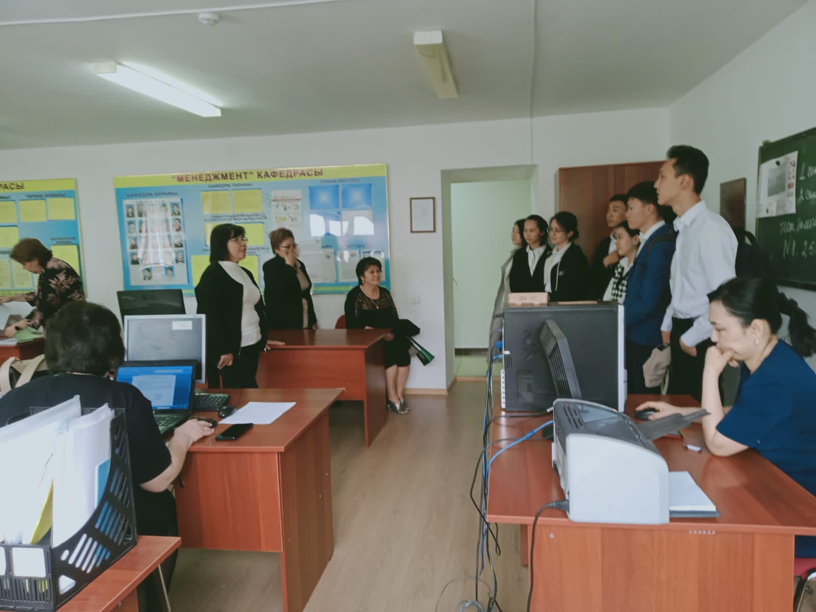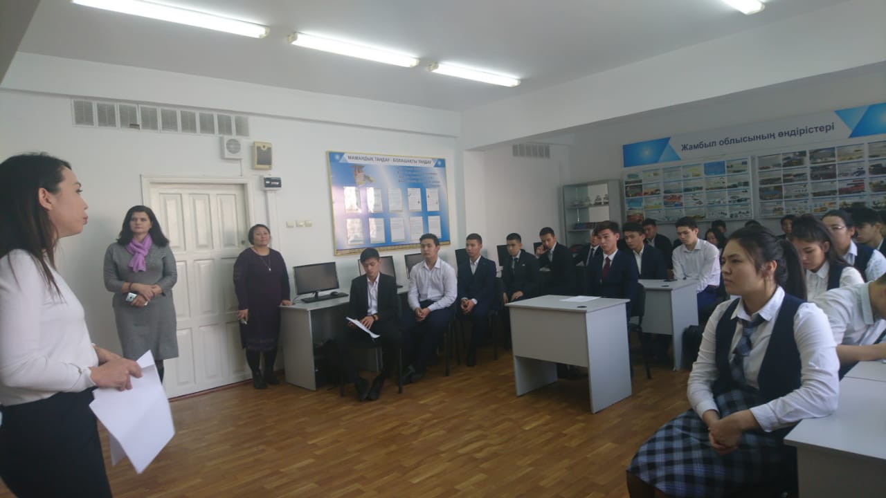 Мектеп бітірушілеріне кәсіби-бағдар жұмыстарын жүргізу университеттің оқу корпустары, кітапханалары, оқу-лабораториялары, факультет деканаты мен кафедраларды таныстырудан басталды. Таныстыру жұмыстарын «Қаржы және есеп» кафедрасының доценті, э.ғ.к., кафедраның ғылыми жұмыстарына жауапты А.Молдабекова жүргізді. «Экономика және құқық» факультетінің деканы з.ғ.к. Қ.Ернишев, «Қаржы және есеп» кафедрасының меңгерушісі э.ғ.к., доцент С.Қожабеков университет жайлы ақпараттармен бөлісті.